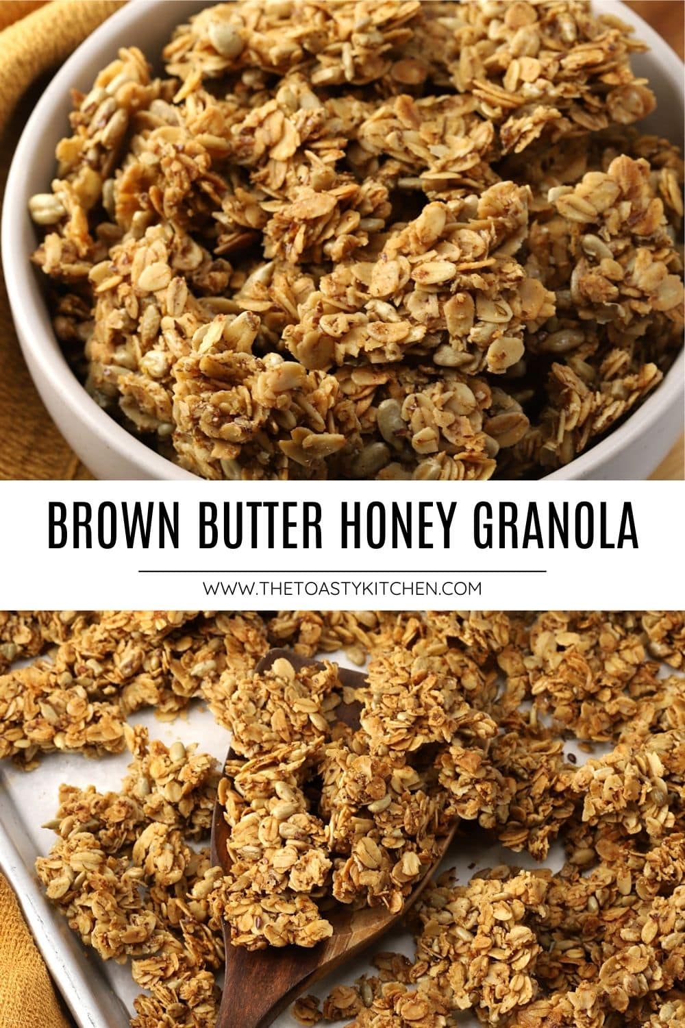 Make a batch of brown butter honey granola for breakfast and snacking all week long. It's made with brown butter, honey, oats, sunflower seeds, flaxseed, and a hint of cinnamon.