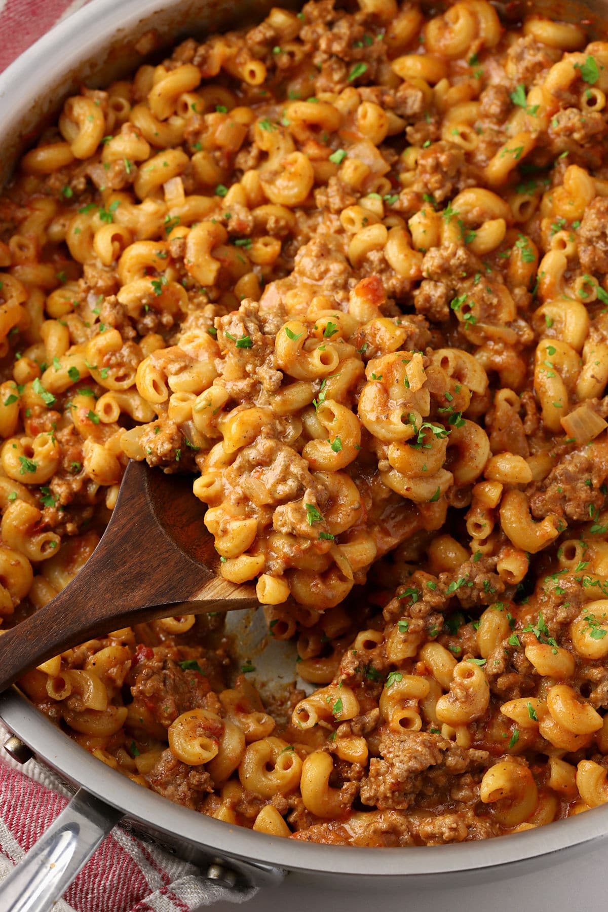 - Variations: Ground beef can be substituted with ground turkey, pork, or chicken. Macaroni can be substituted with any medium shaped pasta.
