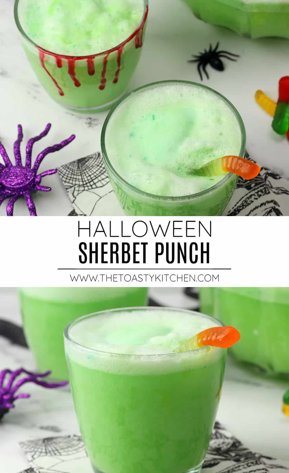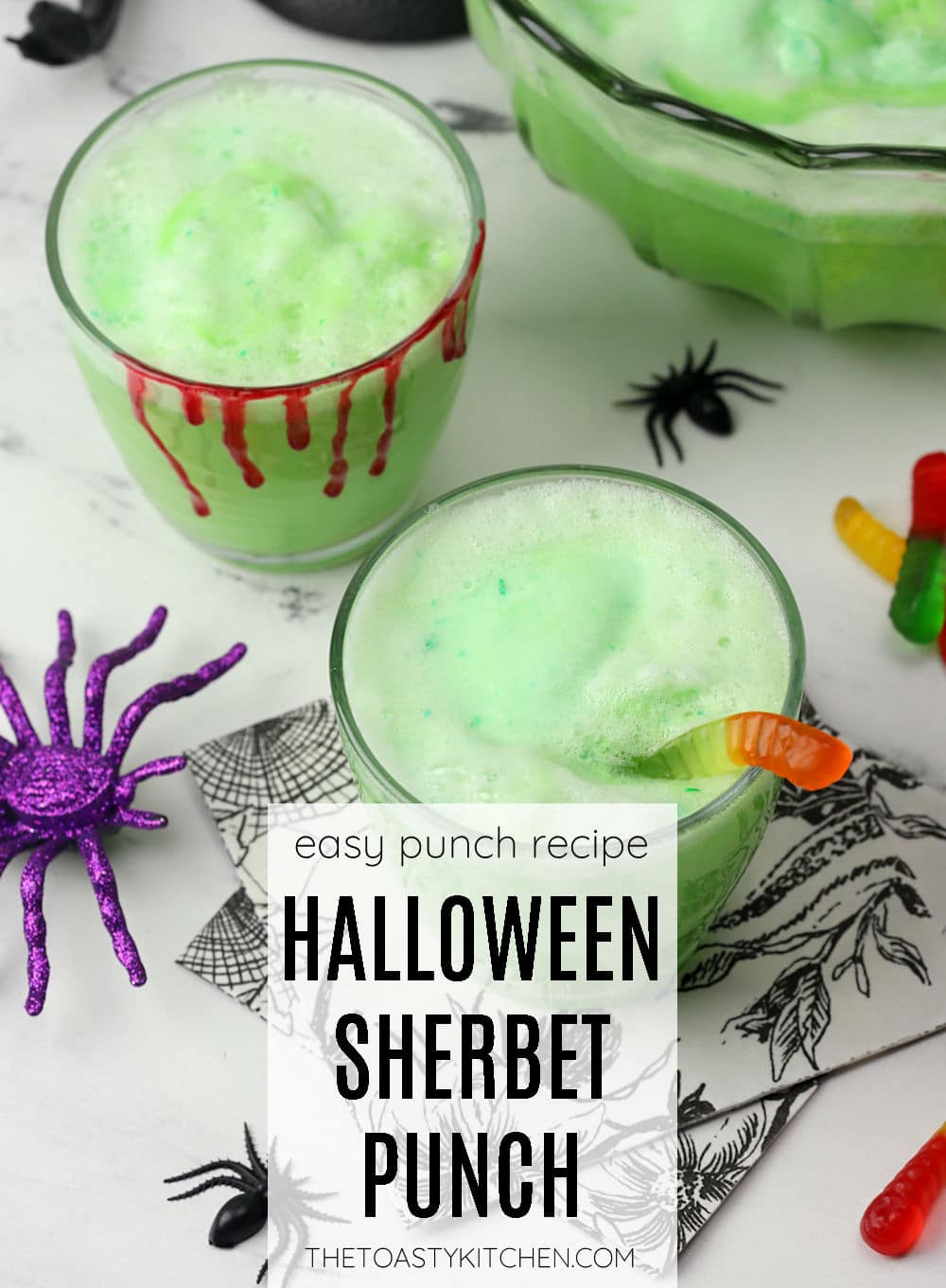 Get your guests in the Halloween spirit with this eye-catching and spooky Halloween sherbet punch. This fruity, bubbly punch is made with lime sherbet and fruit juices - kids will love it! It's easy to toss together in just a few minutes.