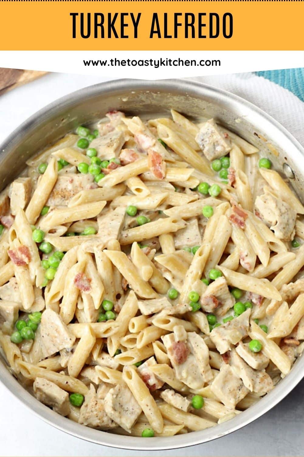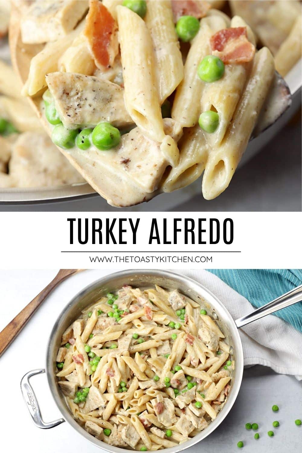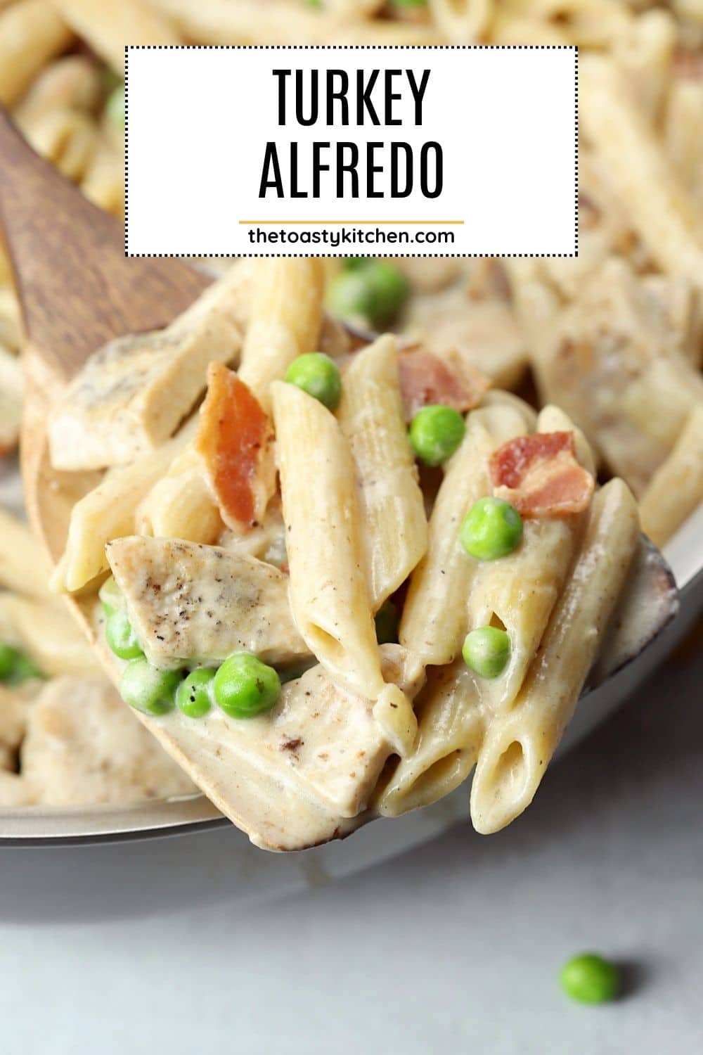 Turkey alfredo is the answer for your post-Thanksgiving leftovers. Roasted turkey, bacon, peas, and penne pasta are coated in a creamy alfredo sauce. It's made in a single pan and ready in 30 minutes!