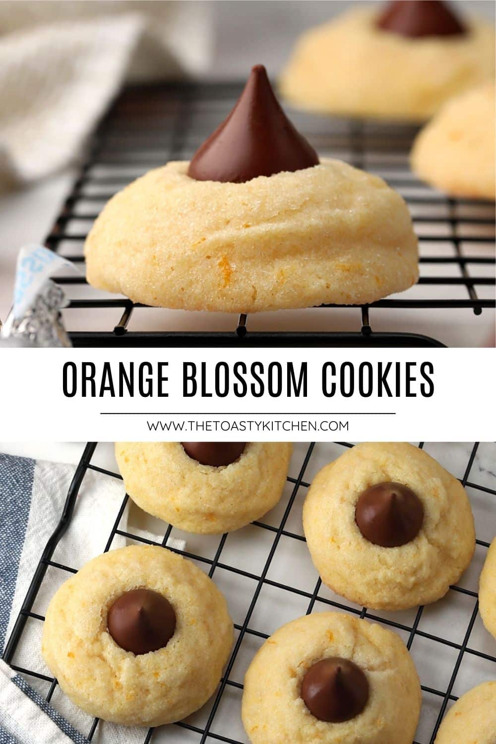Orange blossom cookies are made with tender sugar cookie dough that's filled with fresh orange zest, rolled in sugar, and topped with a Hershey's kiss. Add a batch to your next holiday cookie tray!