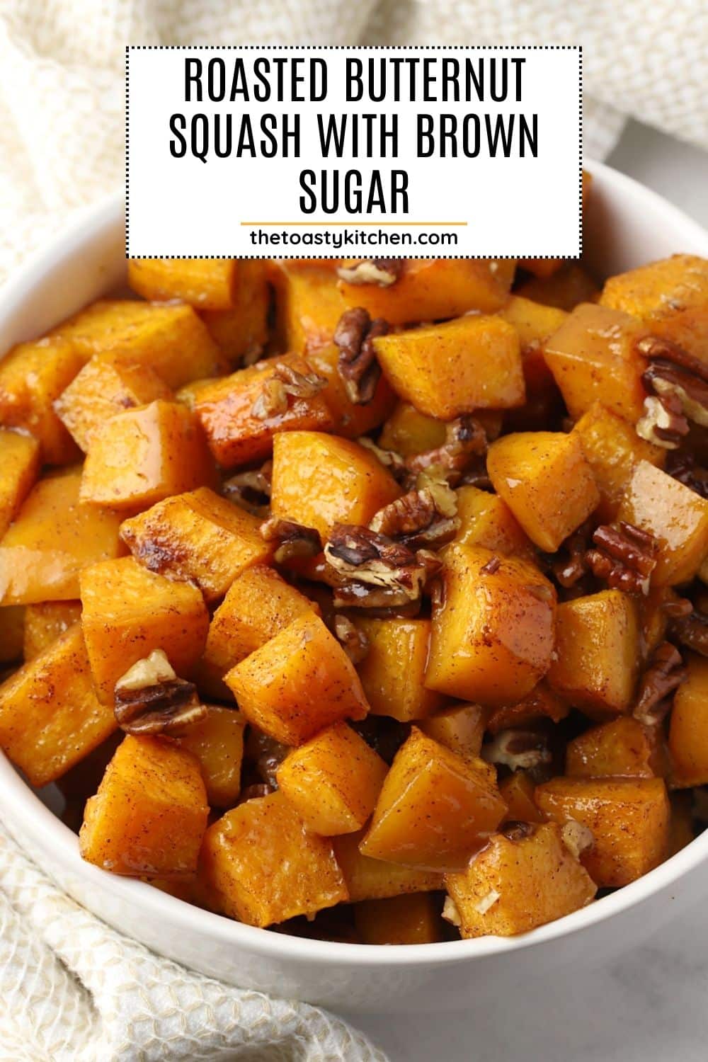 Flavor/texture: Tender roasted butternut squash and crunchy pecans are coated in a sticky brown sugar cinnamon glaze. Butternut squash has a sweet, nutty flavor that pairs perfectly with cinnamon.